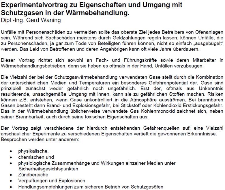 „Experimentalvortrag zu Eigenschaften und Umgang mit Schutzgasen in der Wärmebehandlung“ (Kurzzusammenfassung s. Anlage).